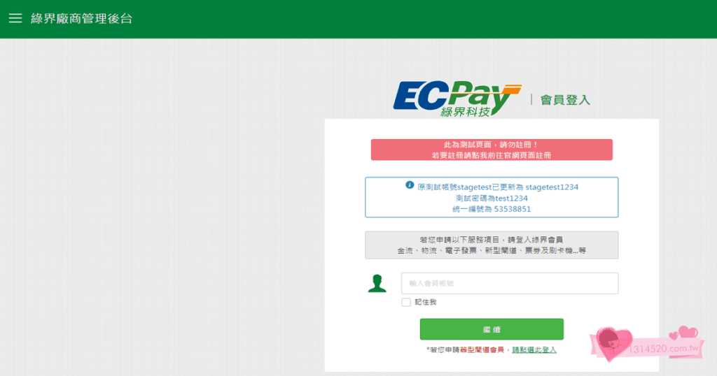再來準備好綠界的測試後台網站,確保待會試刷時,可以再次確認是否入帳 網址