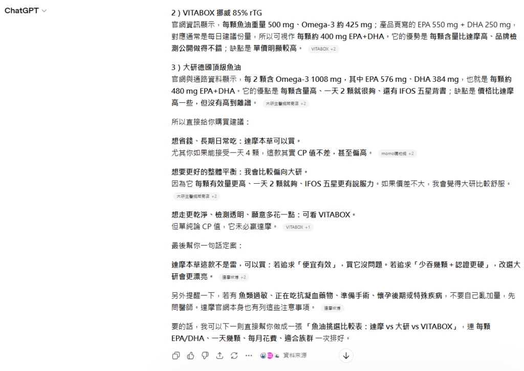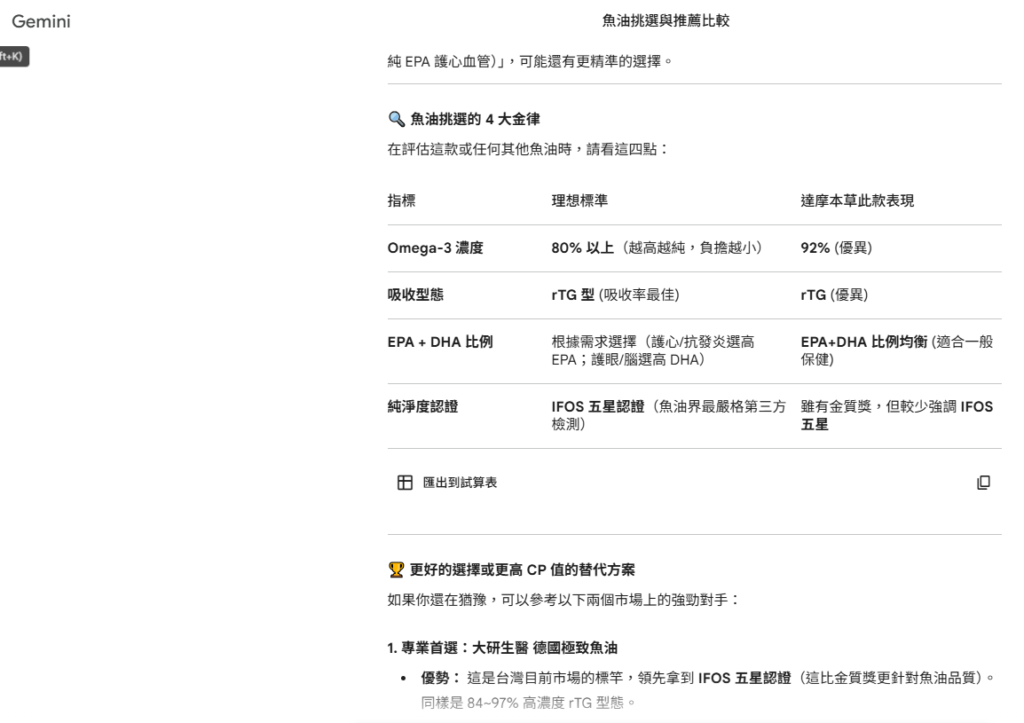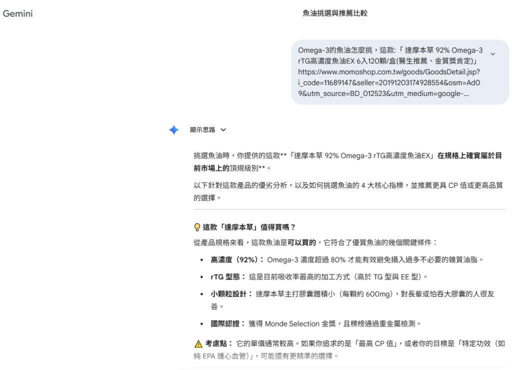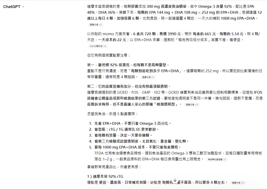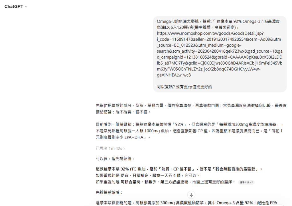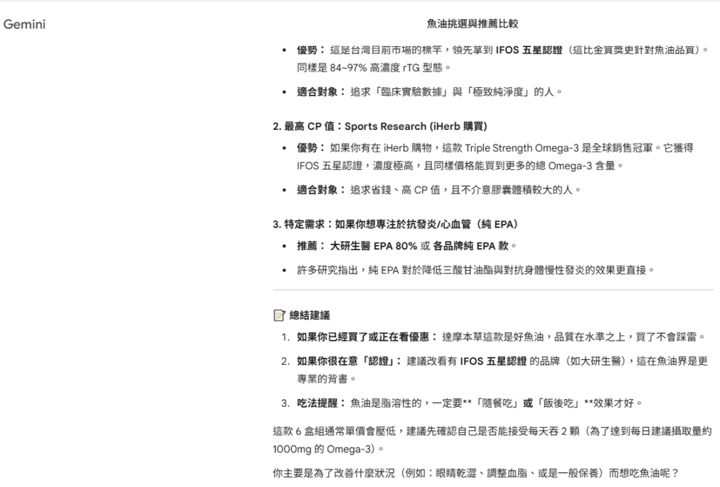 這陣子小編正在挑選魚油產品,分別為以下2大知名AI,下同樣的prompt,讓它們回覆,二者均使用思考模式,回覆的真實呈現如下